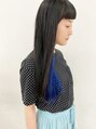 黒髪にインナーをブリーチした髪にブルーをいれたロングスタイル。モード感をたっぷりだしたぱっつん切りっぱなしの前髪とロングヘアです。