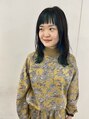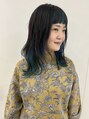 フレーミングカラーの黒×ブルーのモードカラーにオン眉の前髪と重めぱっつんミディアムのスタイル。カラーとスタイルでカッコかわいいスタイルにしたのがポイントです。