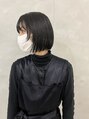 ぱつっとボブに前髪、お顔周りにデザインカットをいれたスタイル。黒髪に近いアッシュ系カラーで艶感をしっかり出し、ウエット仕上げにしました。