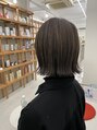 表面にブリーチで細いハイライトを入れ、全体的にほんのり明るくカラーしてます。透明感あるベージュカラーで、外ハネして毛先に動きあるようにスタイリングしてるのがポイント。