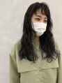 ロングの黒髪パーマスタイル。前髪もオン眉でくるんとカールをつけ、全体は緩すぎず強すぎないしっかりカールを。重くなりすぎないように質感調整してます。