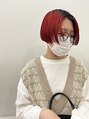 ダブルカラーでつくる赤っぽいオレンジカラーをビビッドにいれたぱつっとボブスタイル。前髪も長めにセンターパート。襟足は内側を少し刈り上げでます。、