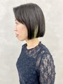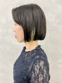 インナーカラーの淡いグリーンがポイントのミニボブ。パツっとしたラインが首元すっきりして夏にもぴったり。黒髪でもインナーに遊び感あるから重すぎないです。