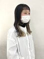 鎖骨下でぱつっと切ったロブに顔まわりにレイヤーを入れ、前髪を束感たっぷりに入れたオン眉にしたスタイル。カラーは全体を黒を活かし、インナーにデザイントリプルカラーでハイトーンベージュをいれてかっこ可愛くしました