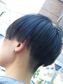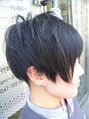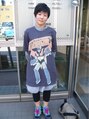 アシンメトリーショートヘアです。左サイドとバックは刈り上げてあります。右サイドはシャープに、左サイドはしっかりラインのでるボブにカットしてあります。個性的でキュートなモデルさんなので最高です。マジンガーZのTシャツが似合っております。