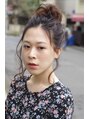 ヘアアレンジ。トップでお団子にまとめて後れ毛を作って出来上がり。これからの季節のお出かけスタイルにセルフアレンジで簡単にできるスタイル。