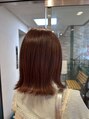 やわらかさと透明感を兼ね備えたピンクベージュカラー。ほんのり甘さを感じる色味が肌なじみも良く、自然光でさらにツヤ感アップ♪毛先はぷつっとラインを残したボブで、まとまりやすく扱いやすいスタイルです。