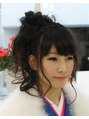 花冠みたいにサイドから編み込んでいます。バルーンっぽく大きめのカールで演出♪厚めの前髪も特徴的!!最後にリボンを作りました☆着物姿も可愛いですね(*^_^*)結婚式・二次会・成人式、お呼ばれパーティ用ヘアアレンジなら高尾まで相談して下さい♪