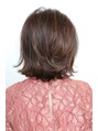 パーマで動きをつけた無造作なミディアムレングススタイルです。乾いた髪、半乾きの髪、濡れた髪いずれの状態でもスタイリングが簡単です。カラーは8トーンのアプリコットブラウン。