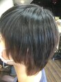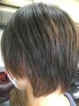 アシンメトリーのショートレイヤーです。バックの毛量が多かったので、かなりタイトに引き締めてレイヤーを入れています。あとは全体的に軽くすいて、馴染みをよくしました。