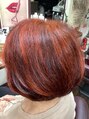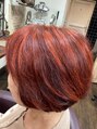 ハイライト&ヘアーマニキュア&カット(ミネラルミストトリートメント)カッパーオレンジのヘアーマニキュアで根元から手先迄明るめの仕上がりにしています。根元に白髪もありましたが、しっかり入っています。艶もあり明るめ希望の方にお勧め!