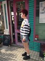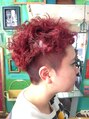 サイド、バックと刈り上げてトップにパーマとブリーチカラーでビビッドなチェリーピンクを入れたファンキーなスタイルパンチの効いたデザインが好きな方オススメです
