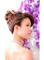 エレガントに魅せるセット片サイドは編み込みの変型リボンの折り重なりとスカルプチャー・カール。片サイドは、シンプルな夜会巻の下に変型4つ編みの格子でスッキリ創りました。