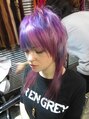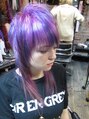 パープルでも薄いパープルから濃いパープルを全体に散らばる様にカラーリングしました。カットは、襟足以外はショートなスタイルです。