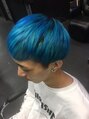 サイド、バックは刈上げて2ブロックに、全体はマッシュベースのヘアスタイル。カラーはね元を黒で残し、隙間からメッシュぽく見えるようにしています。元々ハイトーンだったので、一度のブリーチで水色になりました☆