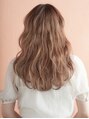 ゆるんとしたウェーブでがかわいい!顔周りのデザインで表情をつけて。カットベースは段を表面に入れる程度にし、後頭部などすいても目立たないところでボリュームをコントロールします。カラーは、アッシュブラウンの透け感カラーで抜け感UP。