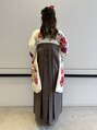 ハーフアップに編み込みを取り入れた華やかなアレンジで、動きのあるやわらかい雰囲気に仕上げました!赤いお花の髪飾りがアクセントになり、袴スタイルをより華やかに見せてくれます。後ろ姿も写真映えする人気のスタイルです。