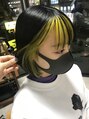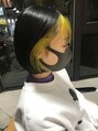全体は暗めのネイビーブルーに顔周りをブリーチして蛍光イエローにカラーしました。カットはぱつっとした収まりのいいボブです。