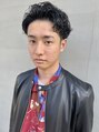 前髪を立ち上げた清潔感のある無造作パーマヘア。サイドから襟足は刈り上げて、収まり良くすっきりとカットしています。前髪を下ろしてスタイリングも可能で、オフの時はラフなスタイリングも楽しめます。ビジネスシーンにも合うので2way可能です。
