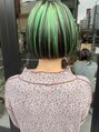 グリーンのセクションカラー。表面の髪のみブリーチをしてグリーンのカラーを入れています。少し個性的で、他とは違ったお洒落が楽しめるスタイルです!ポイントのステップカットもかわいいです!