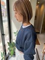 表面が明るめで中が暗めのグレージュで切りっぱなしボブにカラーで立体感が出るようなカラーデザインにしてあります。前髪は薄めで切ってます。