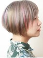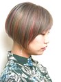 襟足すっきりのひし形前下がりショートボブ。カラフルだけどさりげない、人とは違う個性を求める方にオススメ!ケアブリーチで手触りや色持ちが良く、髪のダメージは最小限に抑えます。