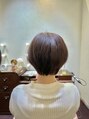 暖色系ベージュで柔らかさに艶感のある髪色にし、丸みのあるショートスタイルです。髪の表面を軽くストレートアイロンを通してオイル系スタイリング材を着けて完了しています。