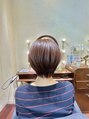 艶感を意識した暖色系ブラウンで自然な髪色に、丸みを出しつつ"クビレ"があるショートスタイルなので、頭の形が綺麗に見え、首が長く綺麗に見えます。スタイリングは手で乾かしオイル系スタイリング材を着けて完了しています。