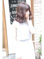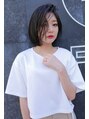 前髪長めBOBの外ハネスタイルであまりきめすぎずオトナ可愛く*ダークアッシュカラーにグロッシーな質感でモードな雰囲気に*あまり明るくできない、ハイトーンにあきてしまった方オススメです。