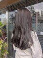 赤みを徹底的に消し去った「シアーグレージュ」なら、暗めのトーンでも光を透かして軽やかな印象に仕上がります。カットは顔まわりを中心にレイヤーを入れ、巻いた時に空気をはらむような「抜け感」をプラスしました。