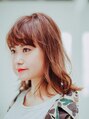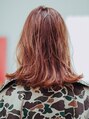 小顔効果のある、ひし形シルエットのミディアムスタイルです。カラーはオレンジベージュ、パーマは全体にゆるくふわっとカールをつけ、前髪は流せるよう方向づけをします。スタイリング剤を揉み込みカールを崩すとカジュアルな雰囲気になります!!