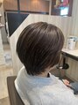 細かいハイライトを入れて、全体を明るく見せながら白髪を自然にぼかしたショートボブ。カラーは髪と頭皮に優しいオーガニックカラーで、柔らかく透明感のあるグレージュに仕上げています。