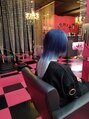 ボブをウルフに もともとブリーチしてたのをリタッチブリーチしてから表面ダメージレスカラーでネイビーブルーにインナーは前回の色落ちをそのまま残して水色に エクステは編み込みで原色ペールブルーを17本 トリートメントで髪の毛に栄養を