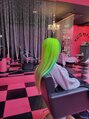 カットは毛先ととのえて量を カラーはもともとブリーチしてたのをリタッチケアブリーチでぬけるだけぬいてカラーバターで原色ライムグリーンに エクステはおへそ下の長さに前髪あわせて70本 前髪原色グリーンに原色ライムグリーンとメッシュで原色グリーン