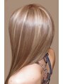 ミルクベージュですね☆うっすら茶味を入れているので汚らしくなく品があります☆メッシュも極力黄味をとり、クリーミーにしてみました。ちなみに肩から下は全てエクステです☆