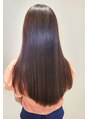 スーパーロングストレート。根元はクセが強いためファイバープレックス縮毛矯正、毛先はリペアのため酸性ストレート。髪が傷まないよう、イノアカラーで艶々サラサラ。アフターケアにケラスターゼカクテルトリートメント使用。