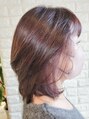 ミディアムレイヤー。バックにくびれをつくり、トップにボリュームを出す。バイオレット系のイノアカラーとピンク系インナーカラーの組み合わせ。ファイバープレックスで前処理後処理にケラスターゼカクテルトリートメント。