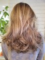 ロングラウンドローレイヤー。顔周りは短く、バックにかけてラウンドにレイヤーを入れたロングスタイル。イノアカラーとハイライトの組み合わせ。ファイバープレックスで前処理し、ケラスターゼカクテルトリートメントて後処理し髪が傷まないように。