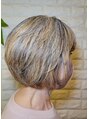 ディスコネボブ。襟足部分をツーブロックに内側を刈り上げたボブスタイル。内側を刈り上げたことにより、バックは丸みをおびたボブスタイルに。白髪ぼかしハイライトで全体的に白髪を活かしたカラーに。ケラスターゼカクテルトリートメント使用。