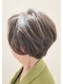 グラデーション。襟足はタイトにスッキリさせ、トップにボリュームを出す。サイドは小顔効果のある長さに設定。イノアカラーとハイライト、ファイバープレックスの組み合わせで立体的に。