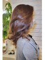 ロングレイヤー。レングスはラウンドさせたローレイヤースタイル。イノアカラーとリファイニングスパの組み合わせで、髪は艶々サラサラに。巻き仕上げ。