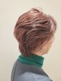 ショートレイヤー。サイド、襟足共にタイトにスッキリさせ後頭部は丸く、サイドは小顔効果のある長さに設定。イノアカラーとハイライト、イヤリングカラーの組み合わせ。メタルDX で前処理、ケラスターゼカクテルトリートメントでアフターケア。