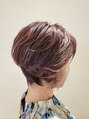 ショートレイヤー。襟足はタイトにスッキリさせ、後頭部は丸く、サイドは小顔効果のある長さに設定。ピンク系イノアカラーとハイライト、イヤリングカラーの組み合わせ。メタルDX で前処理、ケラスターゼカクテルトリートメントでアフターケア。