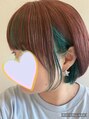 根元のリタッチブリーチ後、表面には8レベルピンク、インナーにはカラーバターのオーシャンブルーを入れました。カットは襟足ギリギリのミニボブでスッキリ可愛く^o^顔まわりチラ見するインナーカラーがポイントです!
