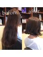 結婚式の為に伸ばしていた髪を、無事に式が終わったのでバッサリカット 。パーマの残りと、もともとの髪のクセを生かした、外ハネ切りっぱなしボブ。柔らかさを残しつつツヤのある髪色で、落ち着いた大人女性のアンニュイな雰囲気を。【表参道】