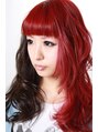 ロックバンドのボーカルを務めるモデルに合わせ、厚めバングで、半分を鮮やかな赤に、半分を6トーンのアッシュに染めて、パンクをイメージ、カワイイ系の顔に合わせて、柔らかくふんわりとしたカールでスタイリングしてみました