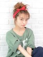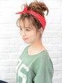 ふんわりお団子にバンダナをプラスしたトレンドスタイル。前髪を一緒に挙げて、残す前髪のバランスを調整すると、さらに今っぽさのある、スケルトンバングに。【EARTH武蔵境】