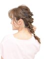 両サイドに毛束を残しくるりんぱを1回。残していた髪を左右からねじって中央に持っていき、まとめて三つ編みで仕上げました。程よくほぐした毛束と、ヘアアクセサリーを複数使いしたことがポイント。結婚式や二次会にも◎。【EARTH盛岡南】