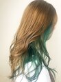 どの髪の長さでもかわいいインナーカラーです。今回は黒髪がもともとのベースだったのでブリーチを2回しております。ベースの色によっては1度ブリーチでも大丈夫です。インナーのグリーンが引き立つようベージュ系でベースのカラーは作ってます。