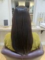 髪は10cmカット、内側に入るように切らせて頂きました。カラーは赤味がなるべく出ないよう寒色カラーで色持ちも考えて、6トーンぐらいに暗くしました。カラーと同時施術可能な酸熱トリートメントで艶髪仕上げです。